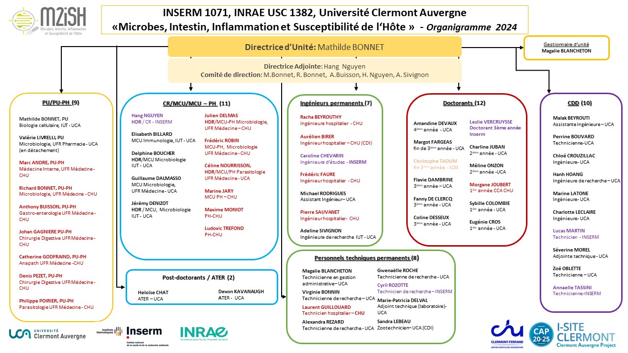 Cette unité (composée d'une équipe) comprend environ 60 personnes, dont une quarantaine de titulaires, avec Mathilde Bonnet (UCA) comme Directrice d’Unité (DU) et Hang Nguyen (Inserm) comme Directrice d’Unité Adjointe (DUA). Les enseignants-chercheurs de l'unité M2iSH appartiennent à 3 composantes (IUT, Faculté de Médecine et Faculté de Pharmacie). Le CHU de Clermont-Ferrand, France, est également pleinement impliqué dans cette unité avec l’intégration des cliniciens des services cliniques de Gastro-entérologie, de Chirurgie Digestive et de Médecine Interne. La présence dans notre laboratoire de jeunes médecins en thèse permet de développer des projets de recherche translationnelle. Notre unité de recherche a été labellisée Inserm en 2012 et est également "Unité Sous Contrat" de l'INRAE (USC-1382) depuis 2005.